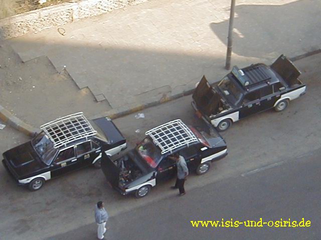 Hier in Kairo wird meist aus mehreren Schrottautos wieder ein "neues" zusammengebaut. Die Autos werden auch auf der Straße gleich repariert. Kairo soll die Stadt mit den meisten Taxis sein.