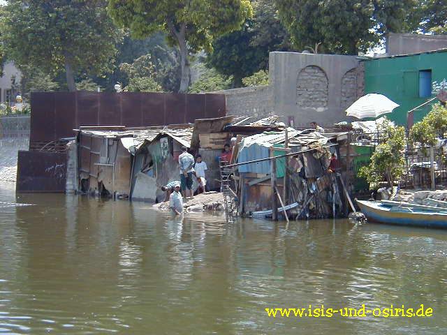 Hier war der Nil mal wieder höher als der Normalpegel, sodaß es auch am Nil noch manchmal zu Hochwasser kommt aber eben nicht mehr in den Massen wie vor dem Bau des Assuan-Staudammes. Wie man aber hier sehen kann stehen die "Häuser" unterwasser.