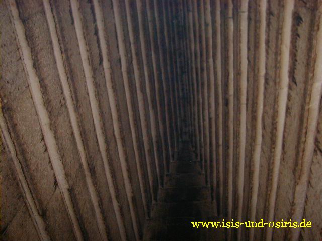 Das Kraggewölbe in der dritten Kammer. Die dritte oder auch Grabkammer ist 8,55 Meter lang und 4,18 Meter breit. (Messungen laut Stadelmann) Das Kraggewölbe ist 12 Meter hoch und besteht aus 11 Kalksteinschichten, von denen jede um ein paar Zentimeter über die darunterliegende herausragt.