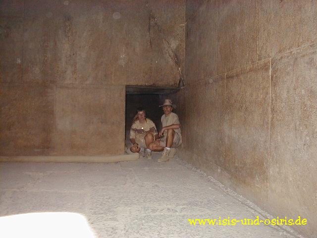 Von der ersten Kammer gelangt man durch diesen kleinen Gang in die zweite Kammer, die 8,36 Meter lang und 3,65 Meter breit ist. Sie weist eine Höhe von 12,31 Meter auf. (Messungen laut Stadelmann) Die zweite Kammer befindet sich genau im Zentrum unter der Pyramidenspitze und hat ebenfalls ein Kraggewölbe mit einer Höhe von 10 Metern.