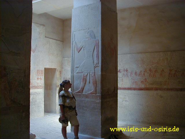 Die Kultkammer (A xIII) des Mereru-ka ist von sechs solchen Pfeilern getragen. Zu sehen ist immer der Grabherr der lebensgroß dargestellt ist. Durch die kleine Türe im hinteren Teil kommt man in den Grabteil seines Sohnes "Meriteti".
