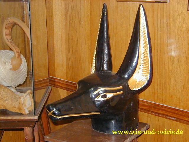 Diese Maske des Anubis wurde von dem Vorlesepriester bei der Mumifizierung getragen. Er hatte die Aufgabe die religiösen Texte zu rezitieren. Anubis ist der Gott der Balsamierer - er hat die Aufgabe den Verstorbenen zum Totengericht zu begleiten und ihn Osiris vorzustellen.