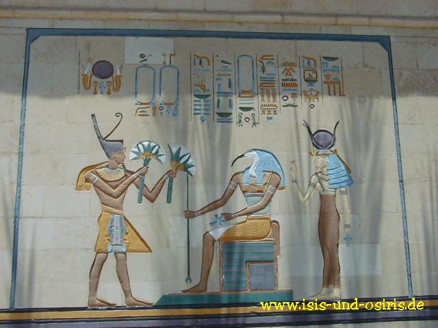 Hier sehen wir die Außenwand des nachgebauten Amun Tempels. Zu sehen ist ein Pharao (leider nicht zu erkennen welcher, da die Kartuschen nicht ausgefüllt sind), der dem Gott Thot Lotusblüten zum Opfer darbringt. Dahinter ist die Göttin Hathor zu erkennen.