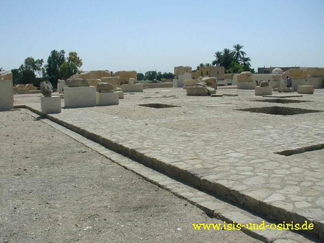 Die Originalpläne des Entdeckers "Petries" wurden von den Schweizern überarbeitet und ergänzt, die Funde an Ort und Stelle auf gemauerten Podesten wieder aufgestellt. Die Standorte von Säulen, Pylonen und der weiteren Gebäude wurden durch neue Schlammziegel-Mauern und Stein-Einlagen wie hier im Boden sichtbar gemacht.