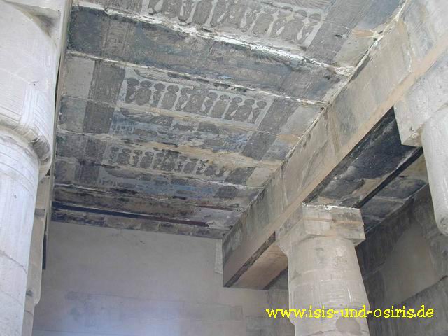 Auf diesen Deckenplatten über dem Mittelgang kann man noch gut die Geflügelte Sonne und die von Schlangen umrahmte Kartusche von Sethos I. erkennen. Auch gut zu sehen ist Nechbet die Herrin von Oberägypten (Geiergöttin).