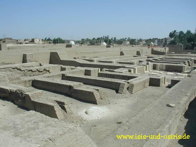 Hier im Totentempel von Sethos I. wurden die Lehmziegelhäuser und Ziegelmagazine das erste mal innerhalb der Umfassungsmauer errichtet. Sie wurden 1976 vom Deutschen Archäologischen Institut freigelegt. Ramses II. hatte diese Variante auch gleich in seinem Totentempel, dem Rameseeum, erbauen lassen. Dort sind sie ebenfalls heute noch zu sehen (siehe auch Bilder Rameseeum)