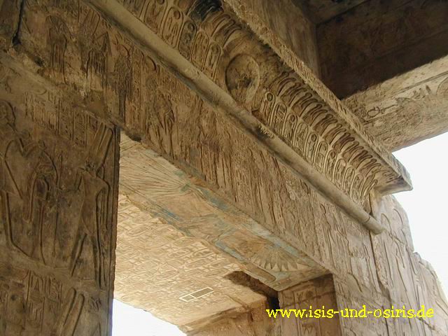 Auf diesem Architrav kann man noch sehr gut die beiden Kartuschen von Sethos I. erkennen. Zu lesen ist ... "Meri-en-Ptah" (Geliebter des Ptah) und in der anderen Kartusche "Men-maat-Re" (Ewig ist die Gerechtigkeit des Re). Man findet auch Kartuschen von Ramses II. "User-maat-re Setep-en-re" wenn man genau hinsieht.