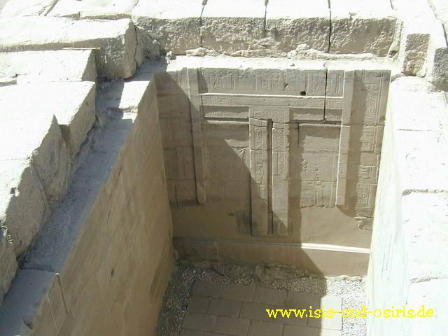 Nun sehen wir unter uns noch einmal die doppelte Scheintür von Ramses II. Man kann an den Deckensteinen auch gut die Konstruktion des Daches erkennen. Der Tempel wurde aus Sandstein aus el-Gabalayn erbaut und ist deshalb heute noch gut erhalten. Der Rest der Anlage war aus Nilschlammziegeln errichtet worden.