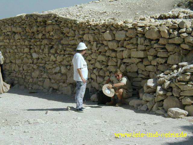 Eine kleine Rast im großen Kulthof musste auch mal sein, bevor es zum eigentlichen Grab geht. Den Hof umgab einst eine Mauer aus ungebrannten Ziegeln mit Abdrücken des königlichen Siegels. Heute bestehen die Mauern aus aufgeschichteten Steinen zur besseren Sicherung gegen Steinschlag.