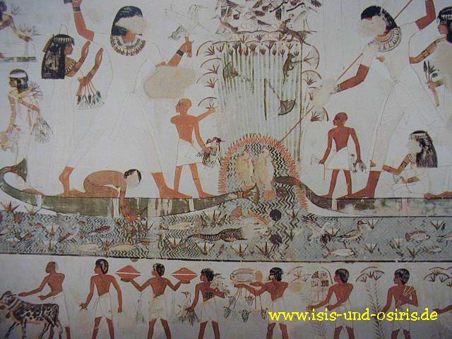 Mena mit seiner Frau und seinen Kindern bei ihrer Lieblingsbeschäftigung dem Fischen und Jagen am Nil. Auf der rechten Seite fängt er die Fische und auf der linken wirft er ein Wurfholz um Vögel zu fangen. Die Darstellung erinnert an die Bilder aus dem Grab von Nacht. Es ist daher naheliegend, dass derselbe Künstler in beiden Gräbern gearbeitet hatte.