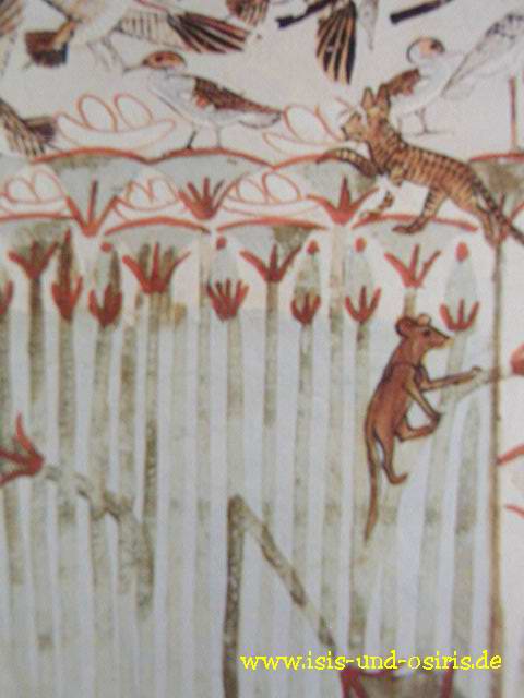 Sehr schön ist die Darstellung von der Maus im Dickicht und der Katze die ihr auflauert. Der Künstler hatte sogar an die abgeknickten Papyrusstängel gedacht die unter der Last der Maus nachgegeben haben.