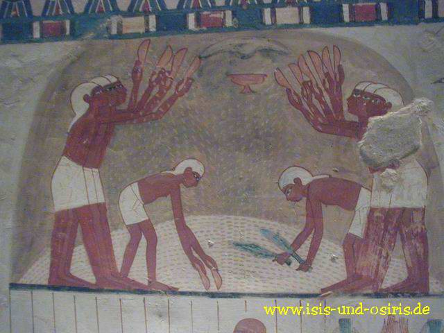 Zwei Gruppen von Landarbeitern dreschen mit Holzflegeln Getreide. Das gedroschene Getreide wird danach in die Luft geworfen damit sich die Spreu vom Weizen trennt. Dieses Verfahren wird auch Worfeln genannt.