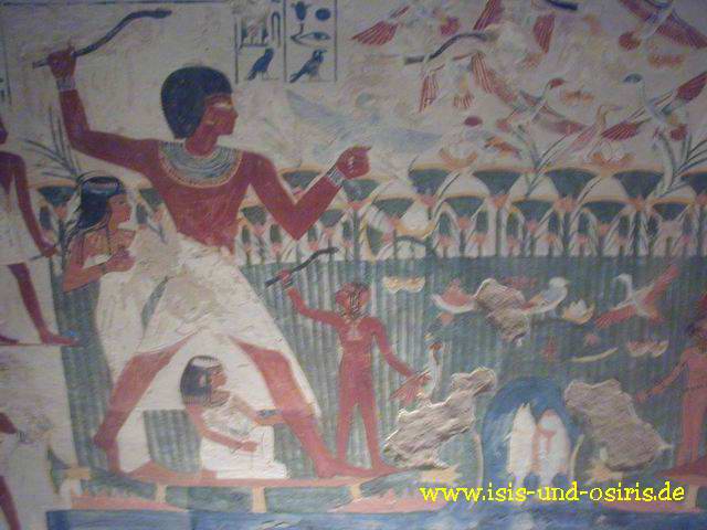 Hier haben wir die gleiche Szene wie im Grab von Menna. Nacht mit seiner Frau und seinen Kindern beim Fischen und Jagen am Nil. Nacht macht jagt auf die Vögel mit dem traditionellen Wurfholz. Die Darstellung erinnert an die Bilder aus dem Grab von Nacht. Es ist daher naheliegend das derselbe Künstler in beiden Gräbern gearbeitet hat.