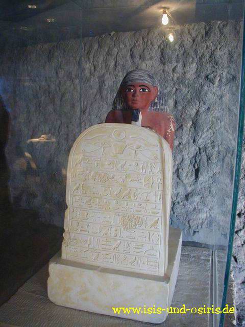 Diese Statue und die Stele sind leider nur Replikate. Die Originale wurden aus dem Grab genommen um in ein Museum in Europa gebracht zu werden. Auf der Überfahrt wurde das Schiff im Ersten Weltkrieg aber torpediert und ging mit den beiden Artefakten unter. Zum Glück wurden die Stücke vorab aufgezeichnet, so daß man heute zumindest noch die Kopien sehen kann.
