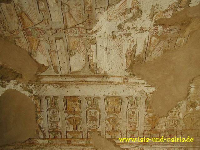 Nechbet wird hier als Geier mit ausgebreiteten Flügeln dargestellt und trägt die weiße Krone Oberägyptens, die hier mit zwei langen Federn flankiert ist, auf dem Haupt. Im unteren Register ist die Göttin Schesmetet (Smithis) dargestellt. Sie ähnelt stark an eine Abbildung von Hathor. Da aber Nechbet besonders mit der kuhgestaltigen Smithis häufig verschmolz, wird sie auch zuweilen als "große Wildkuh, die in Elkab wohnt" erwähnt.