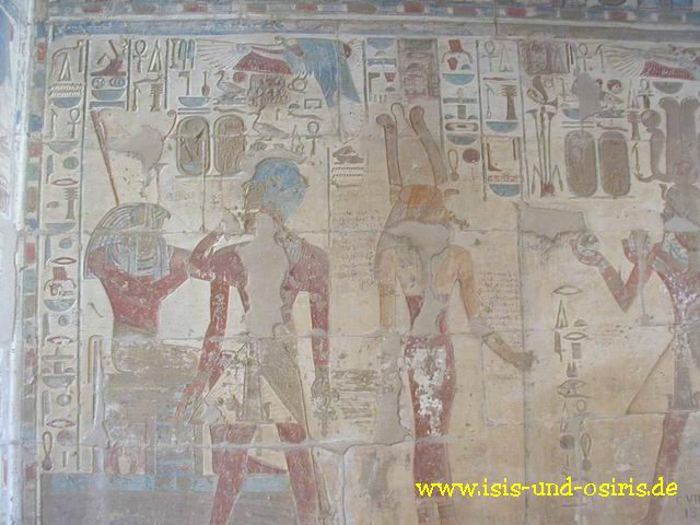 Hier sehen wir wie Neb-maat-re (Amenhotep III.) von Horus gesegnet wird. Über der Darstellung wacht Nechbet schützend mit ihren Flügeln.