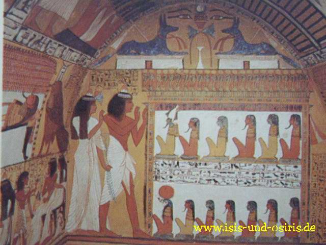Sennedjem und seine Frau Iniferti verehren hier die Götter des Jenseits. Das untere Register führt Re-Harachte an und das obere Register Osiris der Totengott. Über dieser Szene sind die Ewigkeitssymbole zwischen 2 Anubis-Schakalen zu erkennen. Die Grabanlage enthielt nicht nur Sennedjems Mumie, sondern auch die von 19 weiteren Familienmitgliedern. Allein in der Sargkammer wurden 9 davon in Särgen beigesetzt gefunden.