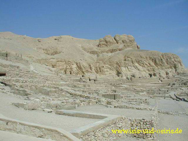 Das Dorf Deir el-Medina war von einer dicken Mauer umgeben. Das Dorf erstreckte sich auf einer Fläche von 132 Metern Länge und 49 Metern Breite. Hier lebten über ein paar Jahrhunderte knapp 100 Familien, die Bildhauer, Steinmetze, Zeichner, Maler und Stukkateure waren. Sie lebten in völliger Isolation. Versorgt wurden die Nekropolen-Arbeiter von Helfern die Lebensmittel, Getränke, Werkzeuge und Arbeitsmaterial brachten. Diese durften aber das Dorf nicht betreten. -->