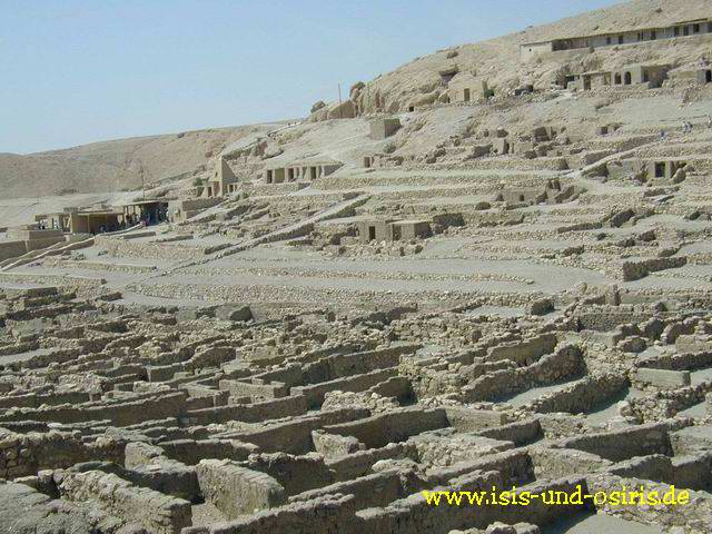 --> In 10-Tage-Wochen wechselten sich diese Arbeits-Trupps ab. Die Arbeiter benötigten ca. drei Stunden Fußmarsch um zu ihrem Arbeitsplatz im Tal der Könige zu gelangen. Aus diesem Grund wurden weitere Häuser in der Nähe des Tals gebaut, so daß die Arbeiter nicht jede Nacht die lange Strecke zurück nach Deir el-Medina antreten mußten. Hier in Deir el-Medina ereignete sich auch der erste bekannte Streik in der Geschichte. Begonnen hatte er im 29. Regierungsjahr Ramses III. (etwa 1155 v.Chr.).
