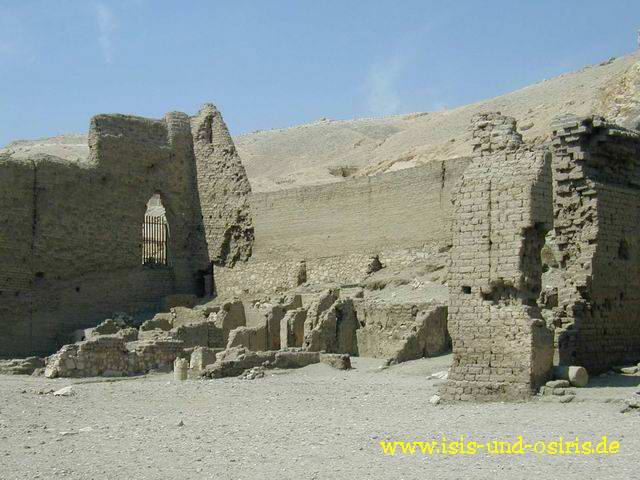 Man betritt den Tempel durch das südöstliche Seitenportal und gelangt dann in den Vorraum des Tempels. Dank der Benutzung der koptischen Mönche die hier lebten sind fast alle Nebenräume erhalten geblieben. Der Mauergürtel ist aus ungebrannten Ziegeln errichtet worden.