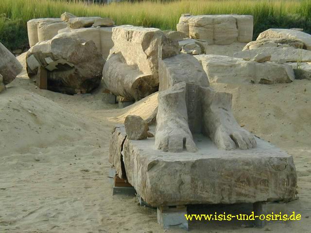Die Fragmente sind alle in geringer Tiefe bei den Grabungen gefunden worden. Der Tempel von Kom el-Hatan stand ja bei der alljährlichen Überflutung des Nils zumindest teilweise unter Wasser. Wenn sich die Fluten dann zurückzogen, erhoben sich der Tempel und die Statuen in einem symbolischen Akt der Wiedergeburt aus dem Wasser. Der Nil hinterließ dann aber auch den schützenden Nilschlamm der die Fragmente unter sich begrub.