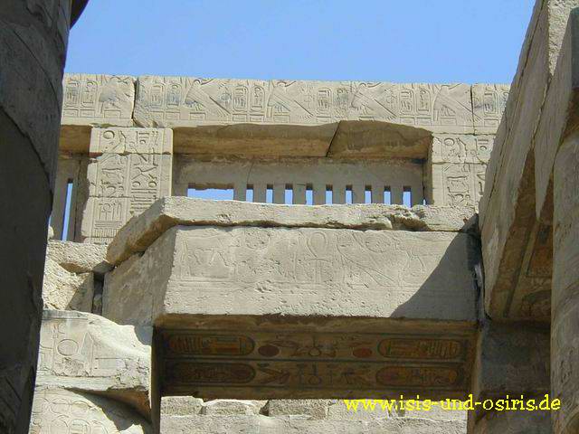 Dieses Fenster hier ist noch fast komplett in seiner Bauweise erhalten geblieben. Auch hier sehen wir die Hieroglyphen um die ganze Fensterfront. Gut zu erkennen sind auch die Kartuschen von Ramses II. der den Bau des großen Säulensaals vollendete. Unter dem Fenster an dem Architrav kann man noch schön die farbig ausgemalten Kartuschen erkennen. Da sie vom Lichteinfluß nicht so geschädigt wurden sind an solchen Stellen im Tempel noch einige farbige Abbildungen zu finden.