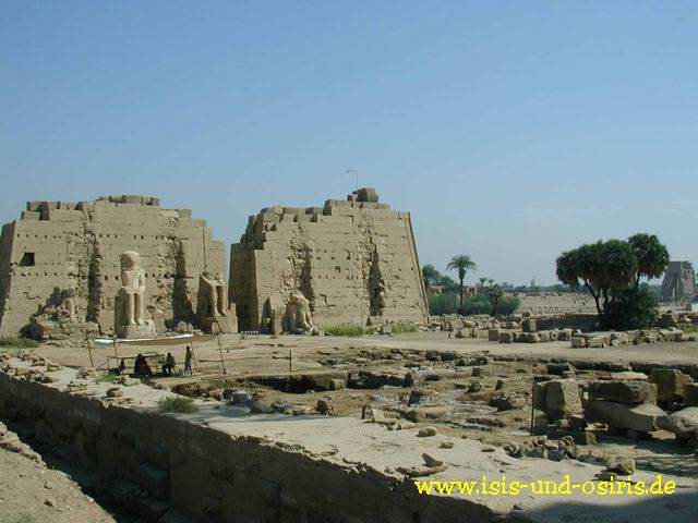 Hier haben wir einen Überblick über das ganze Grabungsareal auf den 8. Pylon. Den 8. Pylon der Hatschepsut ließ Thutmosis III. nach ihrem Tod mit seinen Kartuschen ausschmücken und stellte sich somit als Erbauer dar. Zu sehen sind links und rechts am Eingang Thutmosis III. - im Osten Amen-hotep I. und Amen-hotep II. - leider nur noch Reste der Statuen.