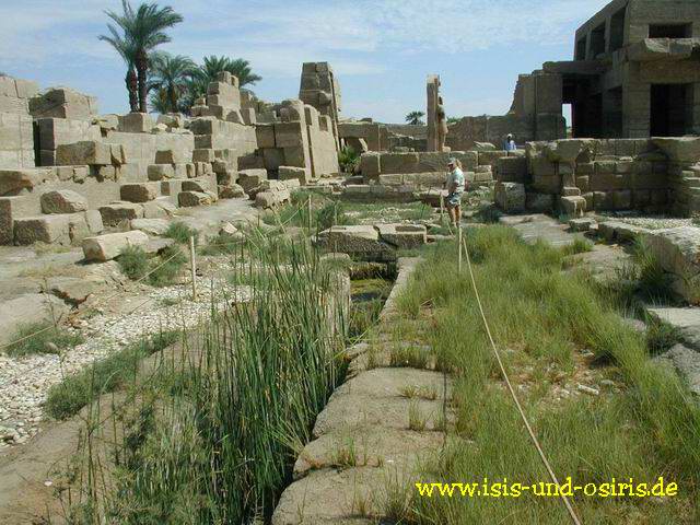 Hier neben dem Festtempel "Ach-Menu" von Thutmosis III. liegt einer der beiden Nilometer vom Karnak Tempel. Mit dem Nilometer wurde der Wasserstand des Nils gemessen, nach dem für die Bauern die Höhe der Abgaben bestimmt und der Reichtum für die Priester errechnet wurde. Im Hintergrund neben der Kolossalgruppe von Thutmosis III., Mut und Amun befindet sich auch eine Treppe, die Schwaller de Lubicz die "Treppe vor dem Zimmer der Wasseruhren" nennt.