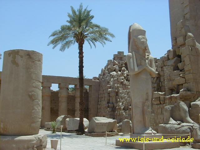 Statue des Ramses II und seiner Tochter Merit-Amun vor dem 2. Pylon