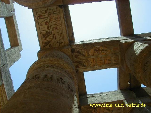 Hieroglyphen an den Dachträgern des Seitenschiffes das von 122 Säulen getragen wurde