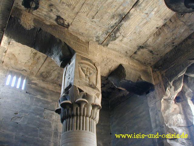 Eine Hathor-Säule in der Opet-Festhalle der Göttin "Ipet", gut zu sehen ist das kleine "Fenster" das nur sehr wenig Licht in den Tempel strömen ließ und das immer weniger wurde, je tiefer man in ihn eintrat