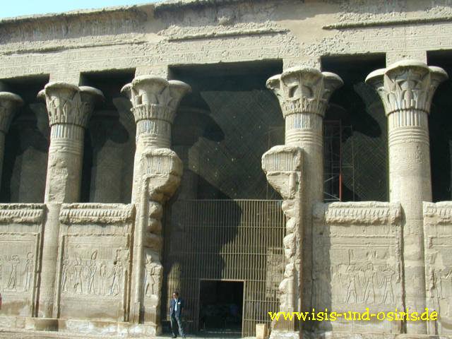 Esna ist dem widderköpfigen Gott Chnum geweiht und liegt 9 m unter dem heutigen Straßenniveau von Esna d.h. die Halle liegt in einer Mulde, in die man hinabsteigen muß