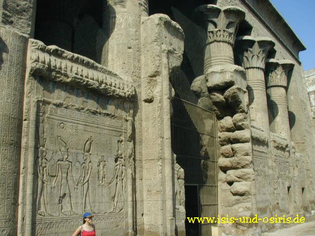 Rechts an der Seite kann man noch schwach sehen wie tief der Tempel heute liegt und wieviel Schlamm die Jahrhunderte in Edfu hinterlassen haben - sodaß das heutige Esna nun 9 m höher ist