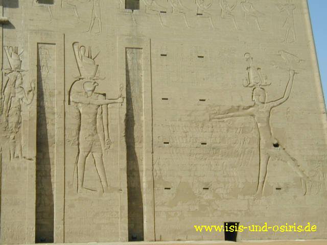 In diesen langen Rillen waren die Fahnenstangen mit den Standarten befestigt. Als Relief sieht man links Hator von Dendera, Horus-Ra und Ptolemaios XII. beim "Erschlagen der Feinde"