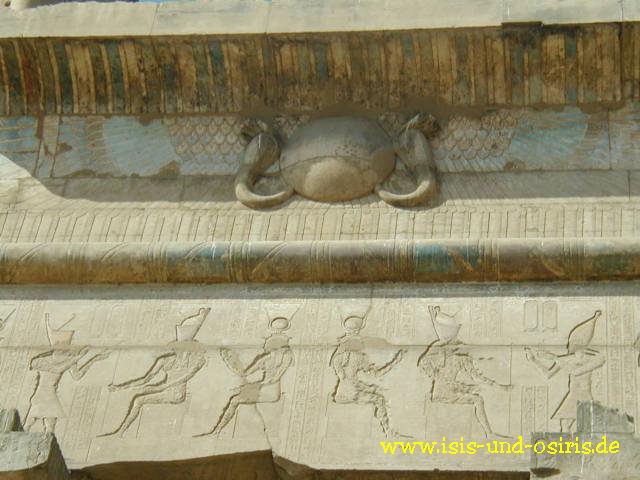 Das Eingangsportal mit der geflügelten Sonnescheibe in den original Farben ... im unteren Register Ptolemaios XII. vor Horus und Hathor ... Der König übergibt den Göttern den Tempel und die sind mit ihm zufrieden und schenken ihm (Land) den Wohlstand