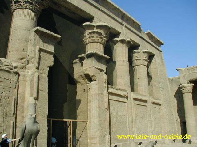 Der innere Pylon, auf dem u.a auch die Krönungsszene von Ptolemaios VIII. dargestellt ist. Dahinter die Säulenhalle mit ihren achtzehn Säulen, die in zwei Reihen stehen