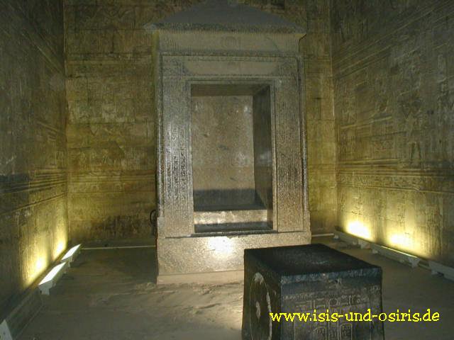 Einer von wenigen erhaltenen "Tabernakel" aus einem grauen vier Meter hohem Granitblock ... an den Mauern werden die täglichen Kulthandlungen (hier leider nicht zu sehen) und die Darbringung des "Maat-Opfers" beschrieben
