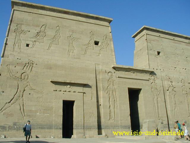 Man erkennt den Pharao Ptolomaios XII. Neo Dionysos, der die Gefangenen am Schopfe packt und erschlägt - zum Opfer für Isis