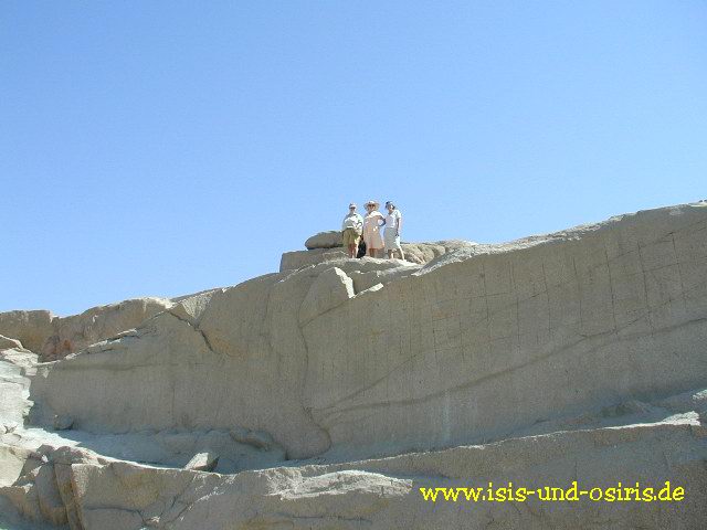 Drei Expeditionsteilnehmer bei der Besichtigung des gigantischen Obelisken