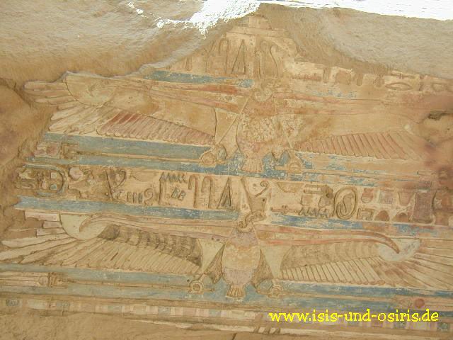 Auf den Decken (Architraven) ist ein Geier dargestellt, Symbol für "Nekhbet" die Göttin Oberägyptens und "Uadjit" für Unterägypten