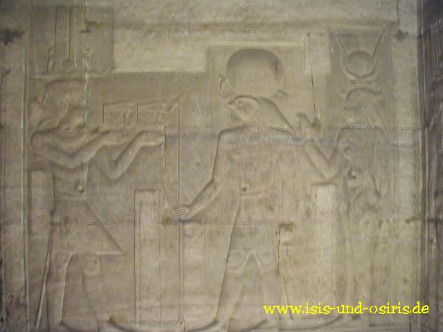 Der Pharao opfert Horus, dahinter ist wahrscheinlich Isis zu sehen
