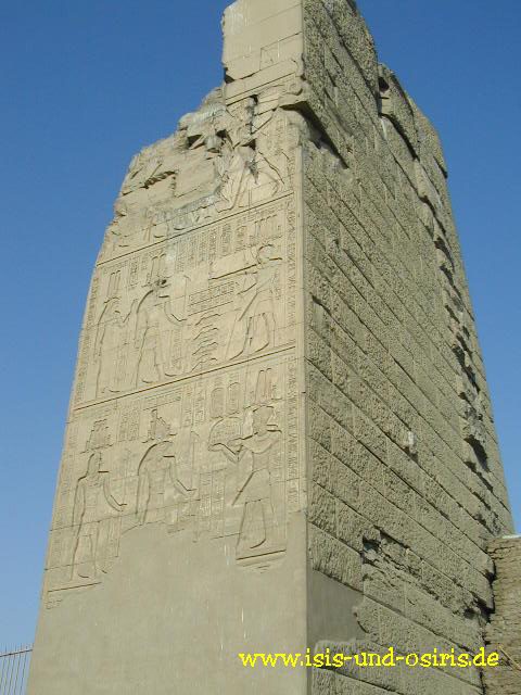 Auf dem Zugangs-Pylon ist der Kaiser Domitian dargestellt, wie er der Göttertriade Sobek,Hathor und Khonsu huldigt