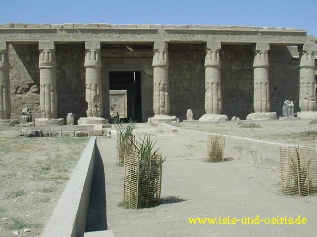 Der Haupteingang führt in die Säulenhalle, die von 6 Papyrussäulen getragen wird. Es gibt aber noch zwei weitere Eingänge (Türen) links und rechts neben den Haupteingang. Der südliche Eingang führt zum Bereich für den Königskult. Der nördliche Eingang führt zum Bereich für den Sonnenkult.