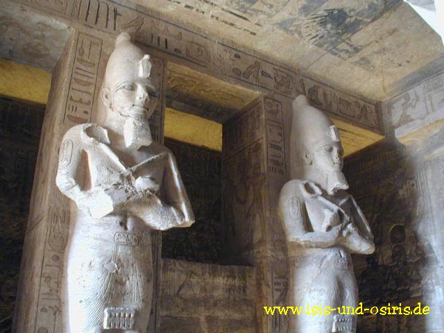 Hier auf der linken Seite sieht man Ramses in Osirishaltung, mit der weisen Krone von Oberägypten - auf der rechten Seite (hinter der Kamera :) ) ist er mit der Doppelkrone dargestellt